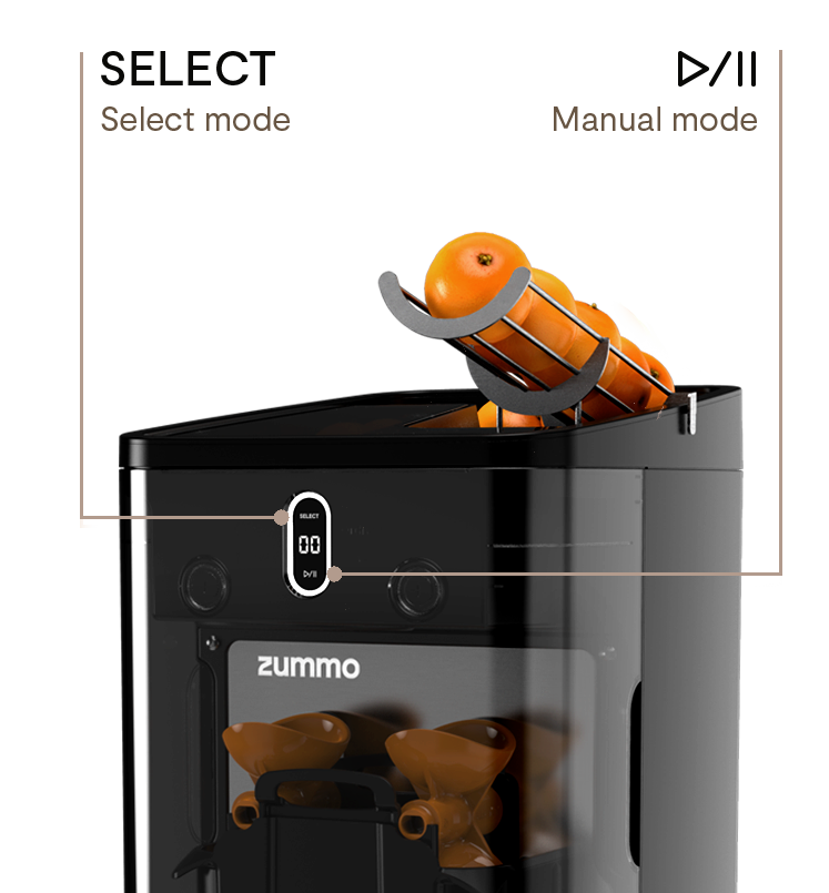 Avec le mode SELECT, vous pouvez définir le nombre de fruits que vous souhaitez presser par verre, et Viva fonctionnera automatiquement. Ou, si vous préférez, avec le mode manuel, vous pouvez contrôler l'extraction vous-même à l'aide du bouton Lecture/Pause.