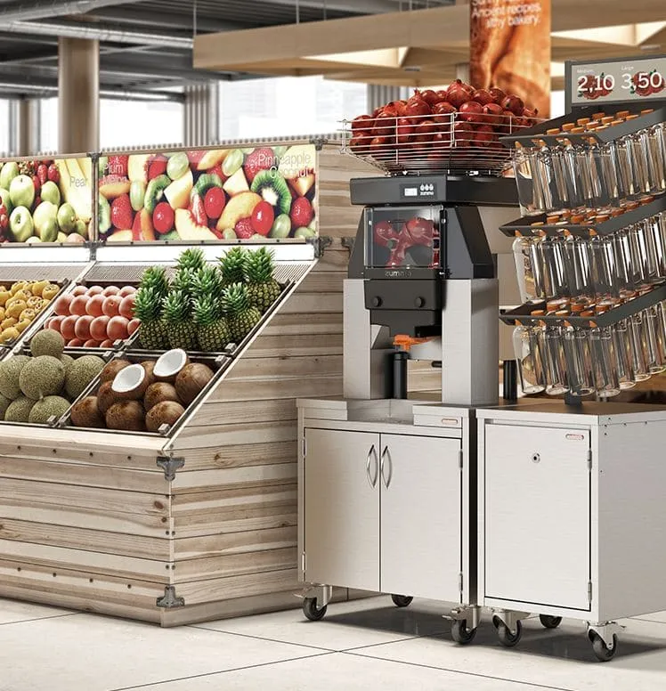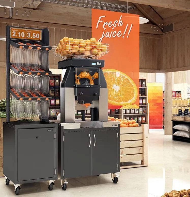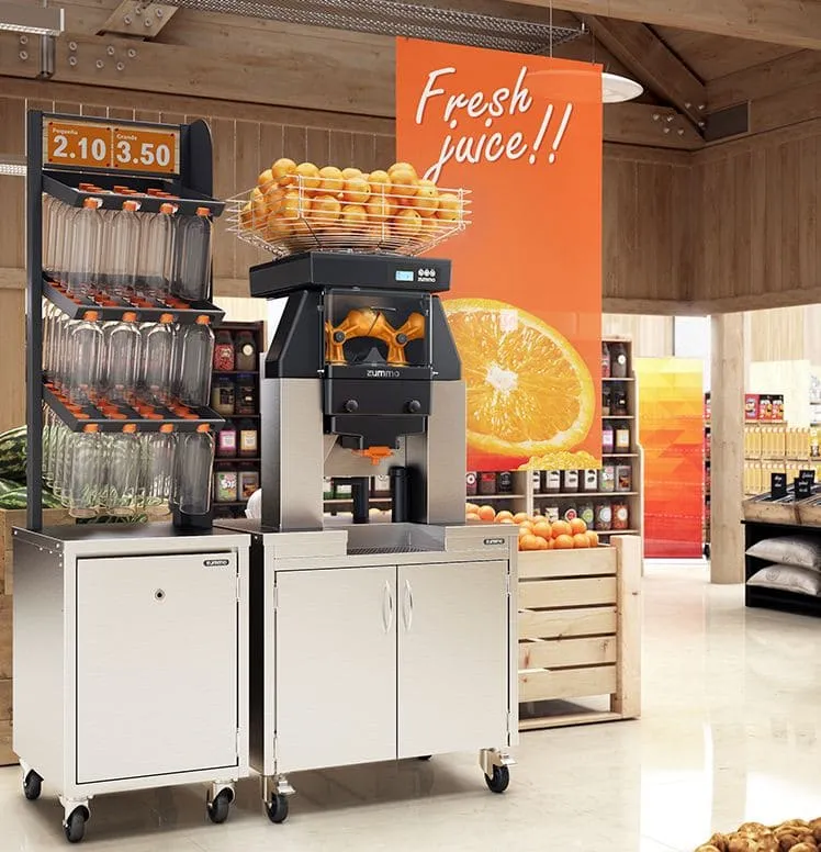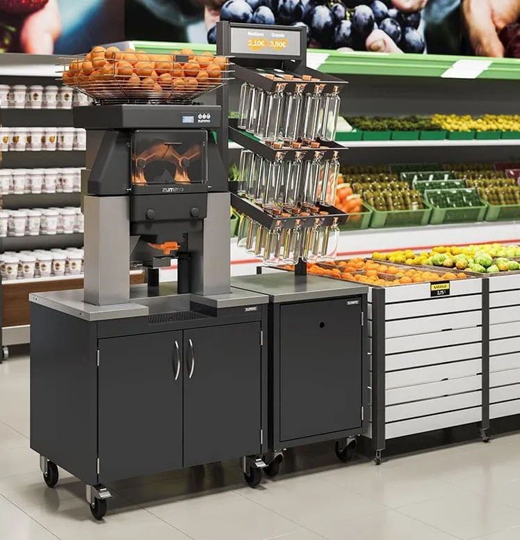 Rendement maximal pour un service en continu Avec ce concept, les besoins spécifiques des supermarchés et des grandes surfaces sont satisfaits Sa grande vitesse de pressage et son large éventail de calibres compatibles font de ce modèle l’option parfaite pour le pressage optimal d’oranges de n’importe quelle taille. C’est votre solution si : Vous pressez des oranges de différentes variétés et de calibre variable Vous cherchez à avoir un pressage varié, avec la possibilité de presser exceptionnellement d’autres fruits comme les grenades, les mandarines, les pamplemousses, etc.